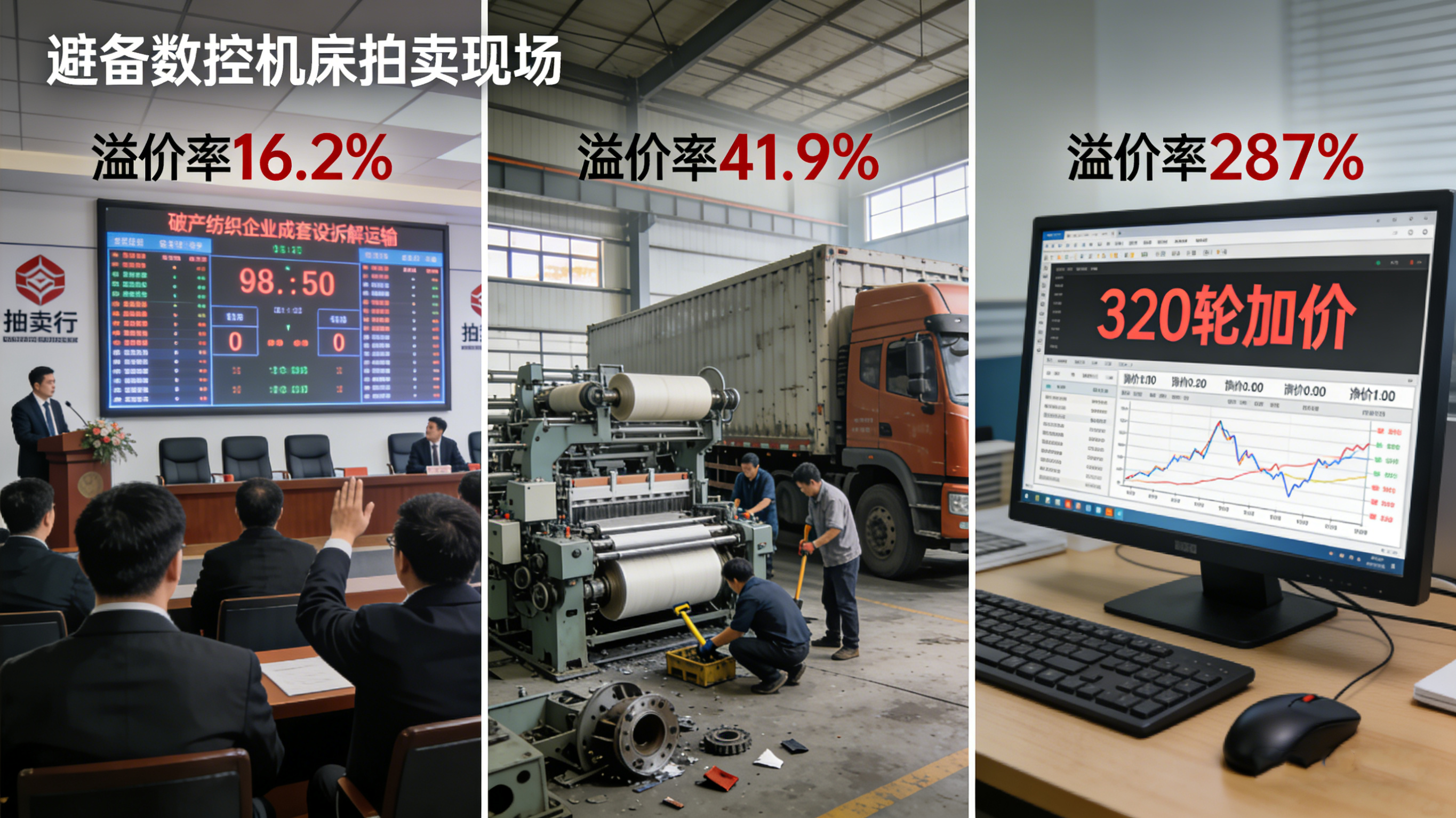 案例二:破产纺织企业成套设备拍卖——115轮竞价增值2110万,高效处置不良资产 承接福州某破产纺织企业名下成套生产设备拍卖项目,标的包括粗纱机、细纱机、进口高产疏棉机等300余项设备,总评估价5041.96万元,设备闲置已久、外观陈旧,且需单独解决运输拆解问题,处置难度较大。江苏汉威拍卖采用“整体打包+分批次推介”模式,联合机械工程师对设备进行全面检修评估,筛选出可翻新再利用的核心设备重点推广;通过线上平台开设专场拍卖,同步定向邀约纺织企业、设备翻新厂商参与,详细披露设备工况、检修报告及运输要求。拍卖过程中竞争激烈,吸引13名竞买人报名,进入延时阶段后仍有竞买人缴纳500万元保证金参与竞价,历经115轮加价博弈,最终以7151.96万元成交,较起拍价增值2110万元,溢价率达41.9%。成交后,专项团队协助买受人办理设备交接,协调制定三个月内的拆解运输方案,对接物流团队解决异地运输难题,确保资产顺利交割,既保障了债权人权益,又推动闲置设备资源再利用。