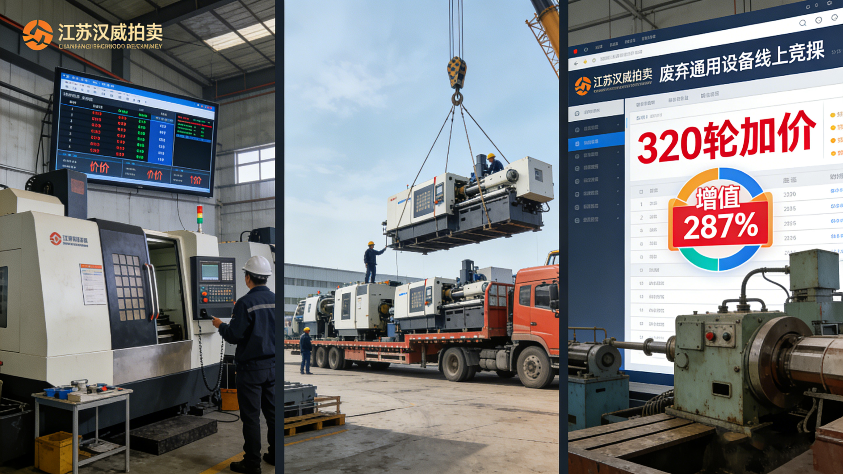 案例三:报废通用设备拍卖——320轮竞价增值287%,小标的撬动大收益 受某国企委托,处置一批报废通用机械设备,标的挂牌价仅3.1万元,因设备零散、价值偏低,传统处置方式效率低下、收益微薄。江苏汉威拍卖依托AI寻源功能,从22万竞买人资源库中精准匹配江苏、上海、北京三地的优质回收企业,搭建线上专场拍卖;通过短视频、行业社群等渠道推广,吸引7名竞买人参与,全程竞价激烈,历经320轮加价,最终以12.17万元成交,增值9.07万元,增值率高达287%。此次处置采用标准化自助流程,大幅缩短曝光周期与沟通成本,通过充分竞价实现报废资产价值最大化,为国有企业小额报废设备处置提供了可复制的高效范式。