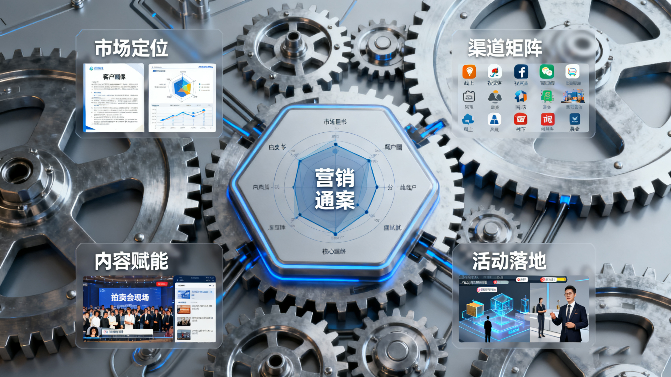 江苏汉威拍卖有限公司的商用拍卖营销通案以“客户为中心”,围绕“市场定位、渠道矩阵、内容赋能、活动落地”四大核心模块,形成闭环式营销逻辑,实现从品牌曝光到成交转化的全流程赋能。